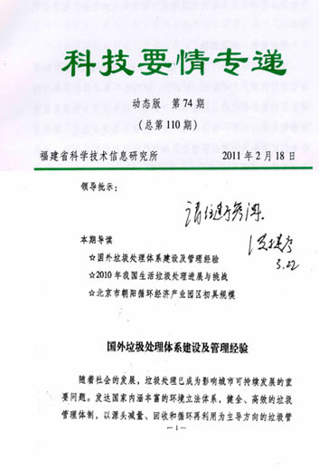 2011年3月22日,省政府洪捷序副省長(zhǎng)對(duì)我所報(bào)送的《科技要情專遞》動(dòng)態(tài)版第74期“城鄉(xiāng)垃圾處理”專輯作出批示:“請(qǐng)住建廳參閱!边@是繼2010年8月10日對(duì)《科技要情專遞》動(dòng)態(tài)版批示后,又一次作出批示。