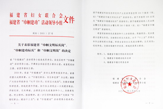 榮獲“福建省巾幗文明標兵崗”和“福建省巾幗文明崗”榮譽稱號