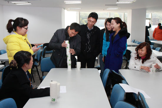 本次活動共設(shè)置了“蒙眼點金”、“水上吹球”、“衣架連連看”、“紙杯搭塔”、“男女雙人背夾氣球跑步競賽”等6個趣味性很強(qiáng)的項目,活動形式新穎、活潑。