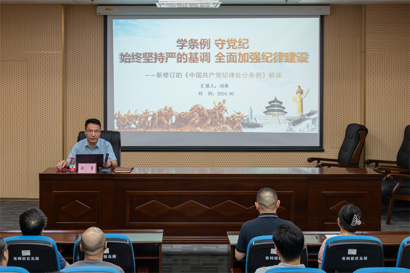 為推動(dòng)黨紀(jì)學(xué)習(xí)教育走深走實(shí),6月27日,我所黨總支紀(jì)檢委員劉勇以《學(xué)條例 守黨紀(jì)——始終堅(jiān)持嚴(yán)的基調(diào) 全面加強(qiáng)紀(jì)律建設(shè)》為題,為全所黨員、中層干部及分管科室講黨紀(jì)學(xué)習(xí)教育專(zhuān)題黨課。
