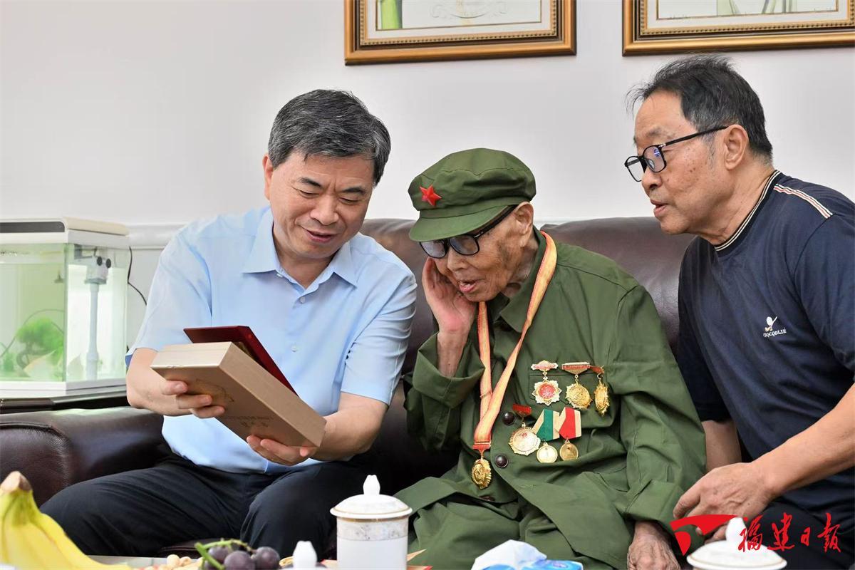 省領(lǐng)導分別來到張輝、李國元、趙宗信、王懷杰、張志一、張玲等抗戰(zhàn)老戰(zhàn)士家中,為他們佩戴紀念章,認真聆聽老戰(zhàn)士講述抗戰(zhàn)故事、回憶崢嶸歲月,感謝老戰(zhàn)士作出的歷史貢獻。省領(lǐng)導說,在各位抗戰(zhàn)英雄身上,充分展現(xiàn)了天下興亡、匹夫有責的愛國情懷,視死如歸、寧死不屈的民族氣節(jié),不畏強暴、血戰(zhàn)到底的英雄氣概,百折不撓、堅韌不拔的必勝信念。黨中央開展一系列活動紀念中國人民抗日戰(zhàn)爭暨世界反法西斯戰(zhàn)爭勝利80周年,再次充分彰顯了以習近平同志為核心的黨中央對抗戰(zhàn)老戰(zhàn)士的高度重視和深切關(guān)懷。福建是著名的革命老區(qū)、中央蘇區(qū),黨史事件多、紅色資源多、革命先輩多,具有光榮的革命傳統(tǒng)和鮮明的紅色基因。全省廣大黨員、干部群眾要永遠銘記為中華民族和中國人民作出貢獻的英雄們,傳承紅色基因,弘揚偉大抗戰(zhàn)精神,切實崇尚英雄、捍衛(wèi)英雄、學習英雄、關(guān)愛英雄,勠力同心為全省在中國式現(xiàn)代化建設(shè)中奮勇爭先而團結(jié)奮斗。要廣泛開展愛國主義教育,大力宣傳和弘揚各位老戰(zhàn)士的革命事跡和革命精神,從中接受精神洗禮、堅定理想信念,更好匯聚新時代新福建建設(shè)的磅礴力量。
